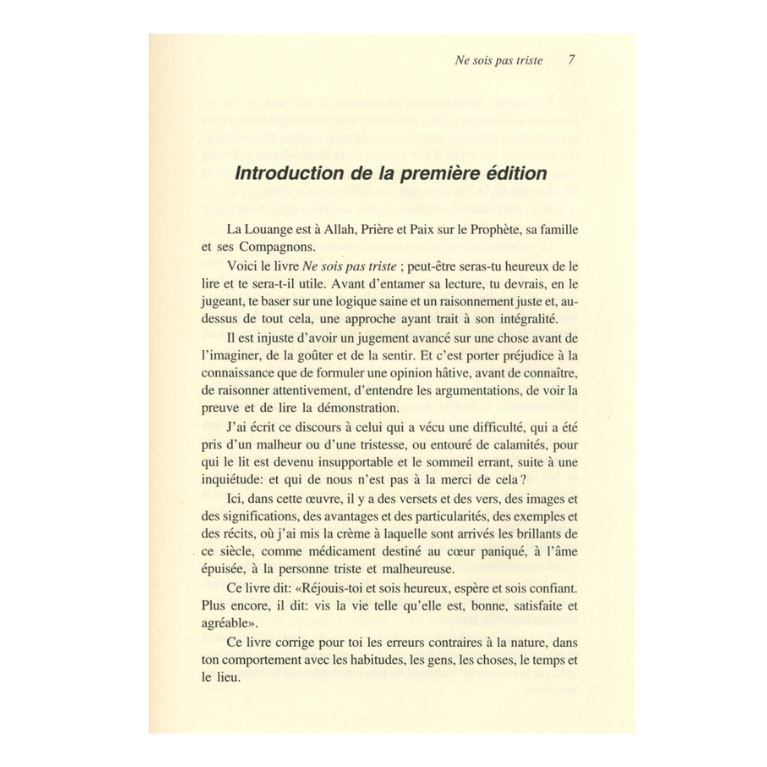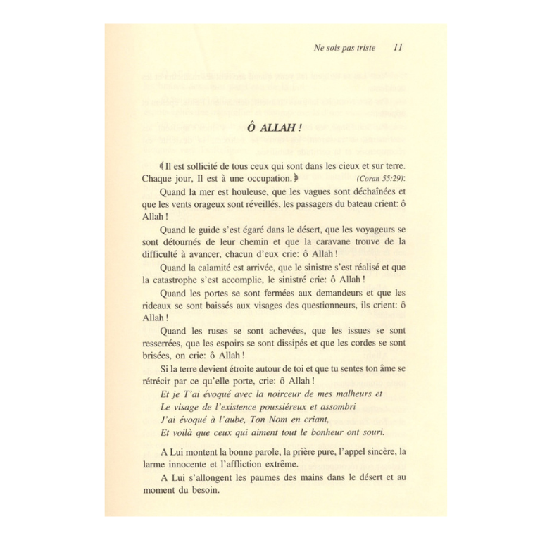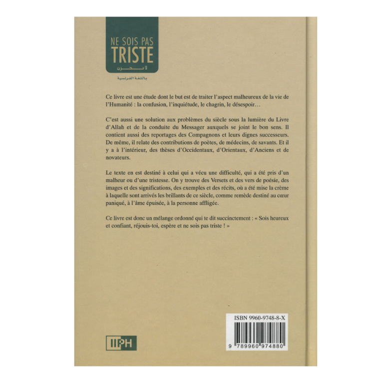 This is the French translation of “Don’t Be Sad” – Ce livre est une étude dont le but est de traiter l’aspect malheureux de la vie de l’Humanité : la confusion, l’inquiétude, le chagrin, le désespoir… C’est aussi une solution aux problèmes du siècle sous la lumière du Livre d’Allah et de la conduite du Messager auxquels se joint le bon sens. Ce livre est primordial et recommandé pour tous. C’est est une étude dont le but est de traiter l’aspect malheureux de la vie de l’Humanité : la confusion, l’inquiétude, le chagrin, le désespoir… C’est aussi une solution aux problèmes du siècle sous la lumière du Livre d’Allah et de la conduite du Messager auxquels se joint le bon sens. Il contient aussi des reportages des Compagnons et leurs dignes successeurs.