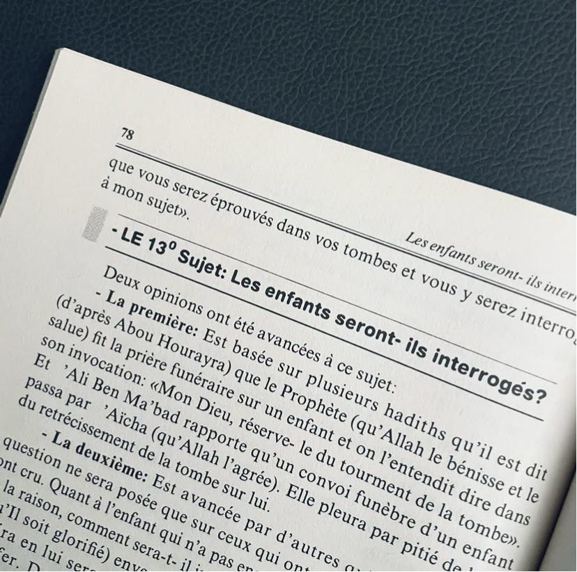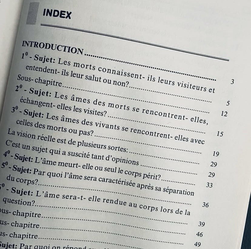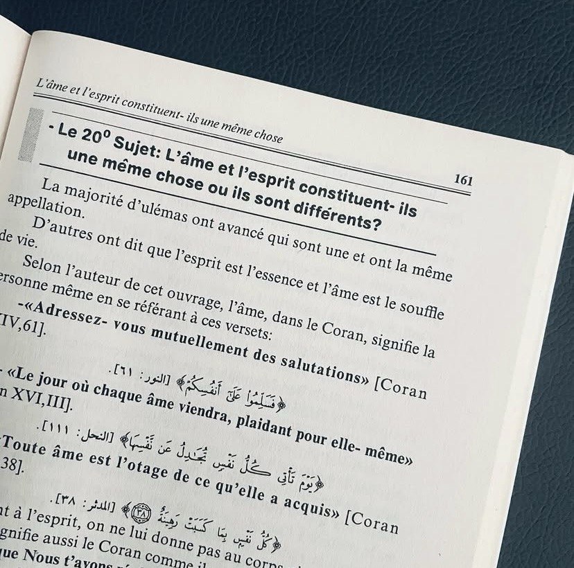 L’Âme […]Tout ce qui concerne les âmes des vivants et des morts, puisé du Livre et de la Tradition.Sommaire:1) Les morts connaissent-ils leurs visiteurs et entendent-ils leur salut ou non?2) Les âmes des morts se rencontrent-elles, échangent-elles les visites?3) Les âmes des vivants se rencontrent-elles avec celles des morts ou pas?4) L’âme meurt-elle ou seul le corp périt?5) Par quoi l’âme sera caractérisé après sa séparation du corps?6) L’âme sera-t-elle rendue au corps lors de la question?7) Par quoi on répond aux dénégateurs et athées qui renient le tourment de la tombe?8) Pourquoi le tourment de la tombe n’est pas cité clairement dans le Coran?9) Quelles sont les causes du tourment de la tombe?10) Les causes et actes qui délivrent?11) La question dans la tombe est-elle générale ou limitée?12) Les musulmans sont-ils les seuls concernés pas la question de Mounkar et Nakir?13) Les enfants seront-ils interrogés?14) Le châtiment de la tombe est-il permanent?15) Où se trouve la demeure des âmes entre la mort et le Jour de la Résurrection?16) Les âmes des morts profitent-elles des oeuvres des vivants?17) Les âmes sont-elles anciennes ou créées ?18) Les âmes sont-elles créées avant le corps ou après?19) Quelle est la réalité de l’âme? Fait-elle partie du corps?20) L’âme et l’esprit constituent-ils une même chose ou ils sont différents?21) L’âme est-elle une ou bien trois?